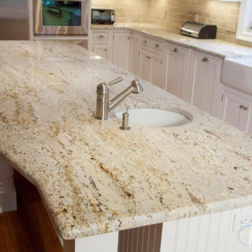 Colonial-Gold Granite is a golden-hued stone, quarried in India. It features a creamy grey background with brown and grey flecks and veining. Depending on the specific piece, this stone can vary in background colours. This type of durable granite is especially recommended in areas with freezing temperatures. The variety of colours allows its use for flooring, cladding, kitchen countertops, and vanity tops. With its durable nature, it can provide a long-term solution to bathroom or kitchen problems.